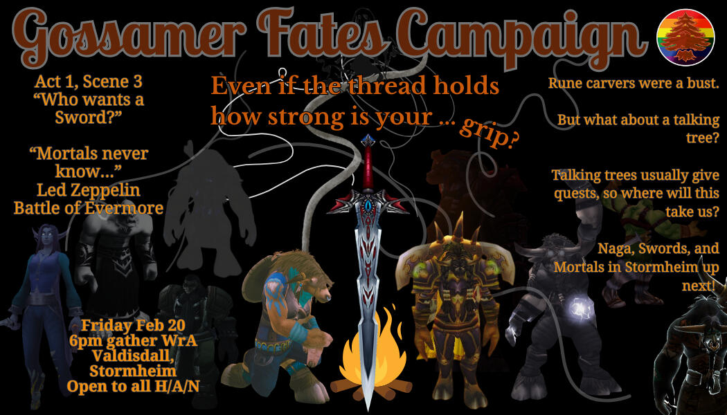 Earthen Ring Escapades returns with a reports and activity meeting Tuesday Feb 3rd - 6pm PST just outside of Bloodhoof VillageGossamer Fates Campaign has started, catch up with Okwaho for information. Every other Friday for main events - but RP as often as you like concerning the events ;)Next event: Fri Feb 20th - "Who Wants a Sword?"Mini campaign starting up with Artimir, msg them for a slot in one of 4 groups. 1st Group Sat 2/21Open Dates: